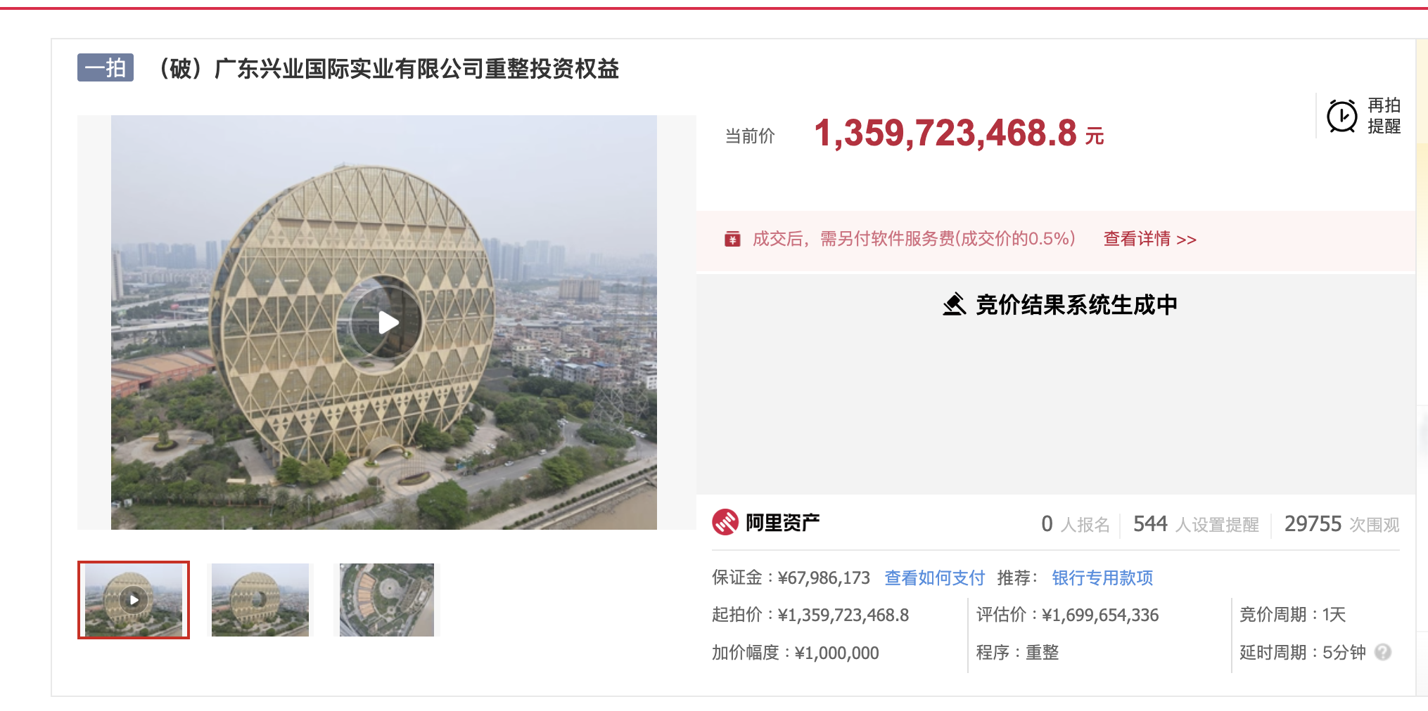 阿里拍卖平台表露的信息娇傲,广州圆大厦拍卖的起拍价为13.6亿元,评估价16.99亿元。该项指标通盘者广东兴业外洋实业有限公司建造于2004年6月22日,注册成本5000万元,法定代表东谈主郑楚英,企业注册地址位于广州市荔湾区荷景路33号自编2栋305房。